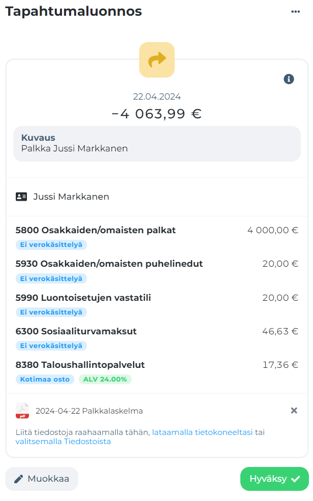 3. Kun veloitus tapahtuu tililtäsi ja olet yhdistänyt pankkisi NOCFOon, teemme kirjausehdotuksen, joka sinun täytyy vain hyväksyä. Lisäämme tapahtumalle myös automaattisesti tositteen palkanmaksusta.